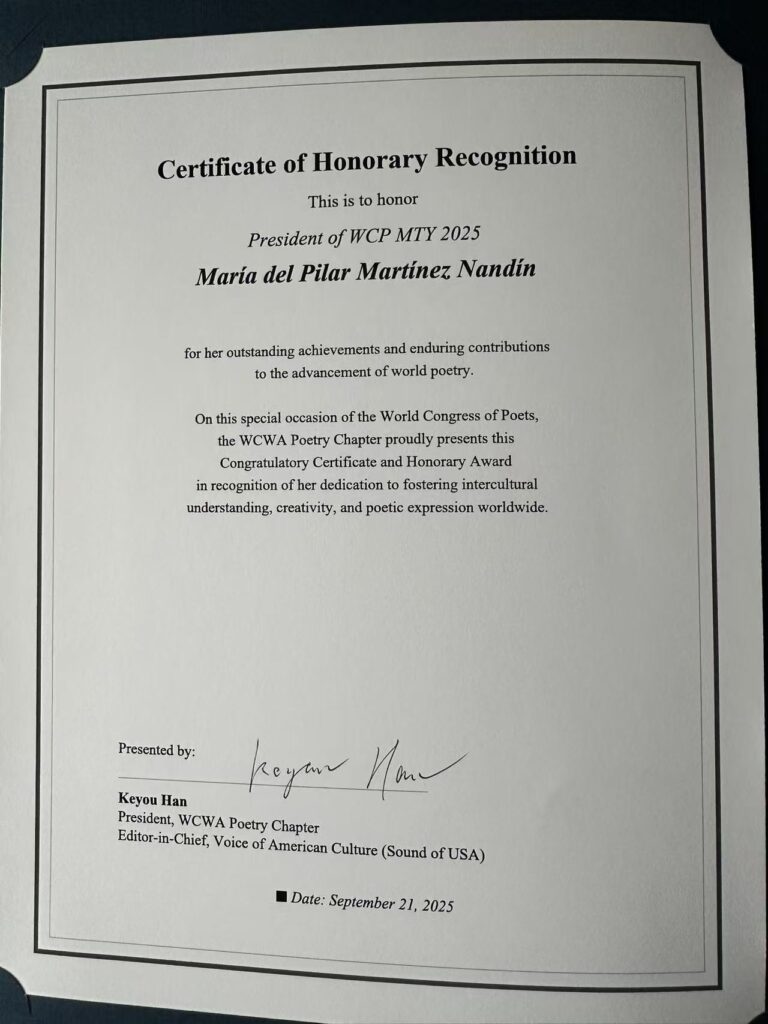 The 44th World Poets’ Congress was held in Monterrey, Mexico, from September 21 to 26, 2025. As head of the delegation, along with Deputy Head Peng Nanlin and Advisor Peng Dan, I led fellow poets from the North American delegation (US, Canada, and UK) to attend this grand event. The five-day conference and field trip in Monterrey was incredibly rewarding and deeply moving. Since returning, I’ve been wanting to write a travelogue, but with so much on my plate, I haven’t gotten around to it until today.