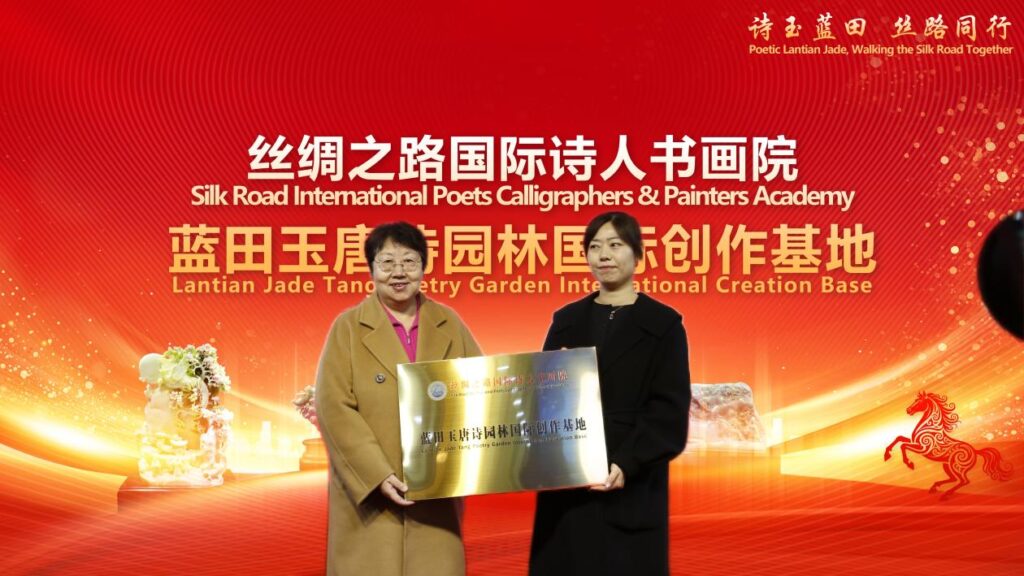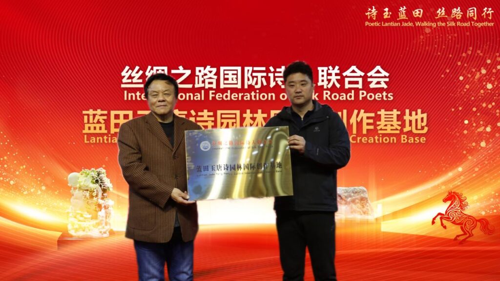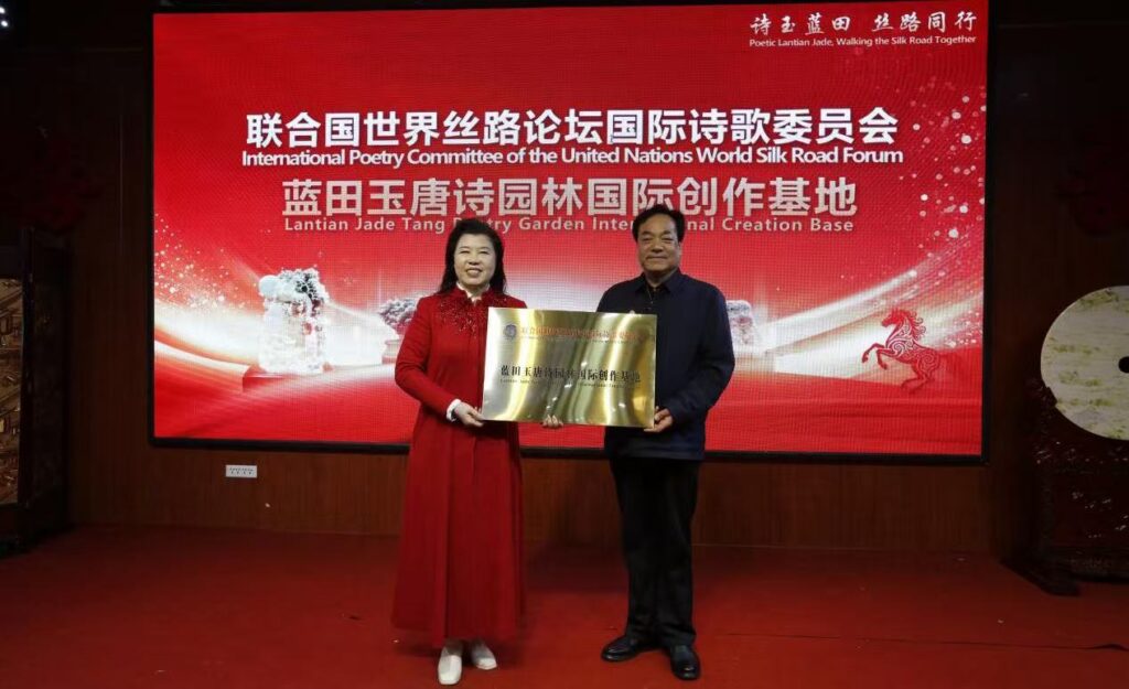 会上,联合国世界丝绸之路论坛国际诗歌委员会、丝绸之路国际诗人联合会主席王芳闻,丝绸之路国际书画院院长、三秦文化研究会副会长解莉芬,陕西唐诗产学研文化发展研究院院长、陕西教育出版社原总编孙毅教授分别为蓝田金鼎玉石国际诗人创作基地授牌。