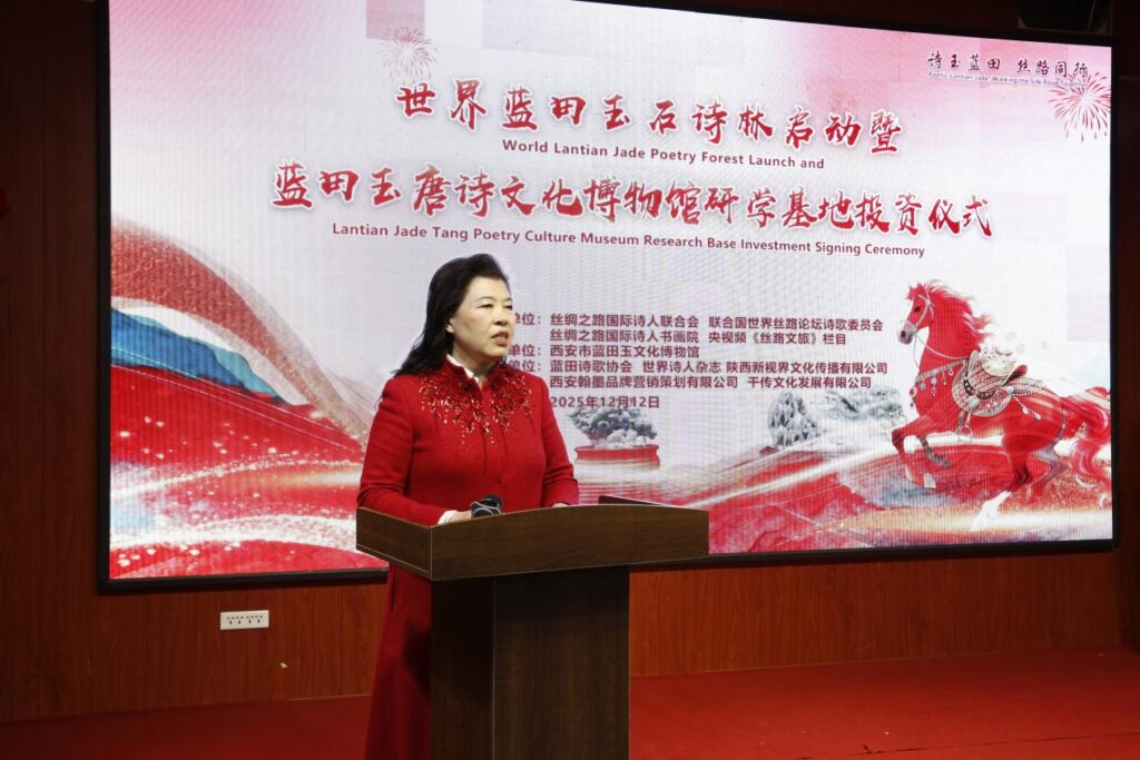 2025年12月12日 蓝田玉山迎来了第一场冬雪,溪水潺潺,美玉生烟。因“丝路”“唐诗”与“玉石”三大文明符号结缘,又乘着西安打造“唐诗之都”的重大历史机遇,来自西安的唐诗专家、唐诗企业家、诗人朗诵艺术家、新闻媒体约百人相聚在西安蓝田金鼎玉石艺园馆,共同见证“世界蓝田玉石诗林”启动暨“蓝田唐诗文化博物馆”投资签约仪式。 丝绸之路国际诗人联合会与唐诗之路产学研研究院、西安金鼎蓝田玉石艺园馆、央视频《丝路文旅》栏目组共同策划了这次活动。这是西安唐诗之都产学研深度融合的重大事件,是唐诗之都和蓝田玉走向世界迈出的铿锵步伐!