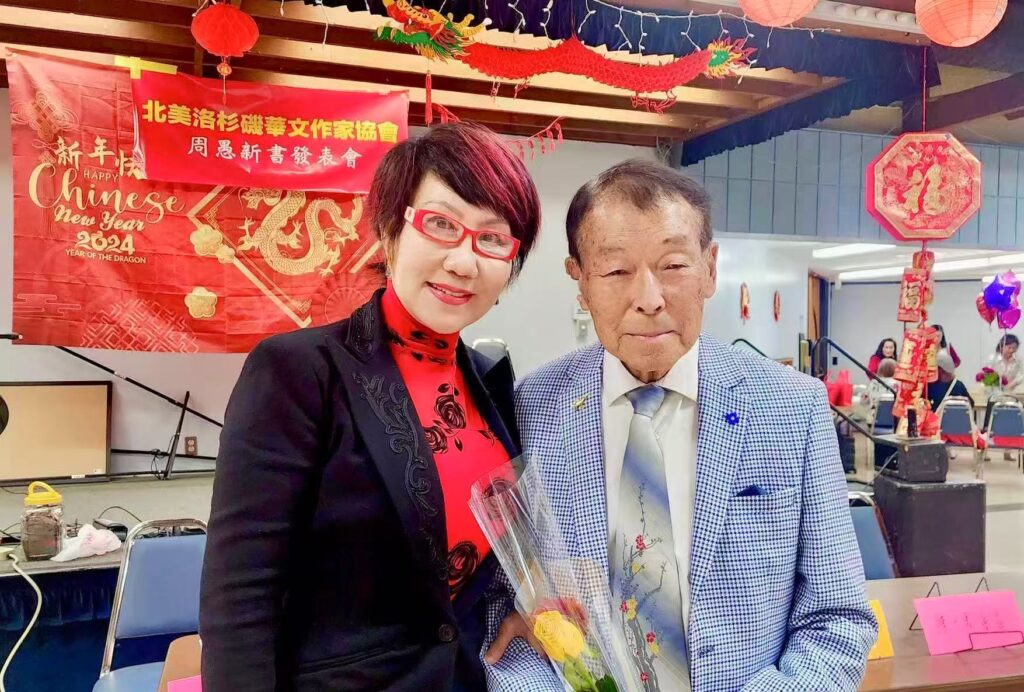 接下来的一幕,令我大开眼界。周愚在《十全十美》一书中报导的十四位北美知名华人,其中七位在我的介绍下一一亮相、上台演讲。我有幸身临其境,亲身感受这些精英的风采:已故空军总司令、华航董事长司徒福将军的夫人司徒冯美玉美丽大方;全美韩华联谊会前会长、现南加州韩华联谊会会长王同勋豁达随和;空军英雄、华航 747 教官机师毛节盛精明干练;南加州大专联合校友会理事长崔文标,从年轻时的帅气潇洒到如今的成熟稳健,风采依旧。美食专家林慧懿身着浅花吊带长裙,打扮亮丽,谈吐间尽显聪慧,难以想像如此优雅女性竟对厨艺有如此精深研究。张明玉会长早已介绍,无需赘言。而前台视著名节目主持人李睿舟的幽默与睿智,则值得多书几笔。他的登场赢得满堂彩。适逢周愚新书发表、美国生活电台开播一周年与「洛城作家」出版社十周年庆,李老师即兴编了两段脍炙人口的顺口溜,并献唱一首别出心裁的「生日快乐歌」,将现场气氛推向高潮。在此与大家分享: