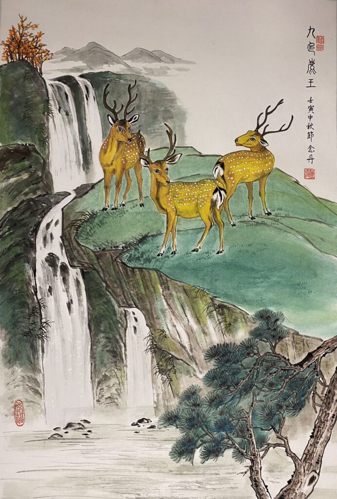在這次書畫展中, 畫家何念丹把《九色鹿王》捐贈給佛光緣美術館永久收藏, 同時這次展覽中, 還有念丹仁兄近期創作的十七米長卷《鹿苑長春》,由各種姿態的一百零一隻梅花鹿組成;而另一幅長卷為十三米長卷, 題為《百零八雀躍圖》, 引起了轟動. 非常榮幸的是, 在十七米長的《鹿苑長春》的百鹿圖中, 我被邀請在卷首題詩作賦. 記得還是在疫情期間的一個晚秋的日子, 我驅車前去念丹兄位於爾灣的藝術工作室. 念丹兄嫂已經備好了茶點和筆墨, 鋪開了長卷, 在卷首題寫了賀詩: 梅花傲雪立, 鹿寓福壽全; 梅鹿寫意好, 神筆何念丹. 魯安敬題, 辛丑秋月