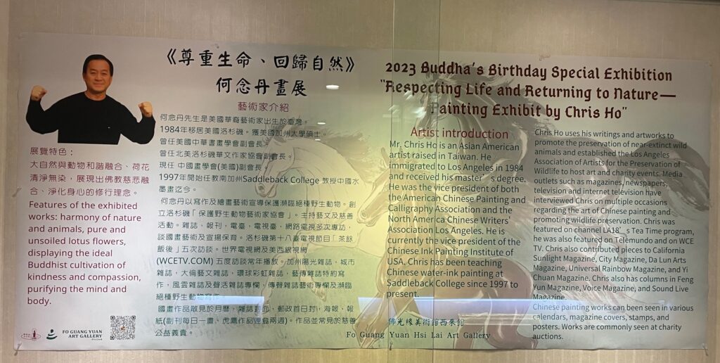 二零二三年的五月二十六日, 是一年一度的佛誕節, 又稱“浴佛節”, “華嚴會”等, 是慶祝佛教創始人釋迦摩尼佛誕生的日子.這一天在西半球最大的佛教廟宇, 由星雲大師親手創辦的美國加州洛杉磯西來寺, 舉行了旅美知名畫家何念丹《尊重生命, 回歸自然》書畫大展開幕儀式, 西來寺住持法師釋慧東, 佛光緣美術館主任釋慧軒, 以及洛杉磯的好友, 書畫藝術家歐碧嫻,林漢章伉儷, 孫曉華、彭南林、劉安莉、宋大勇、張法聖、以及《美洲文化之声》国际传媒网总编韩舸友等各界朋友出席。正如孫曉華先生在採訪時表示的那樣, “今天是佛誕日, 我們尊重生命, 回歸自然, 期待中美友好, 世界和平.”
