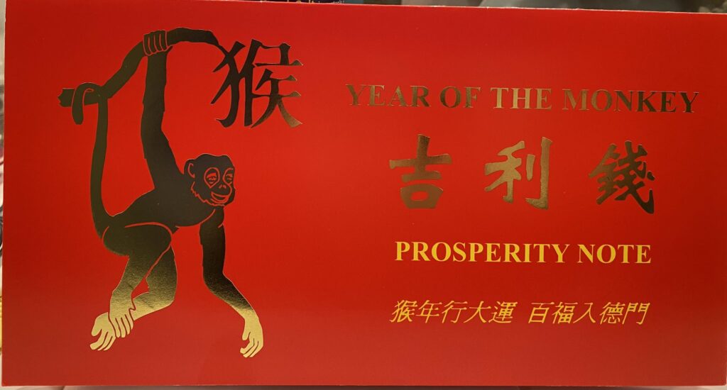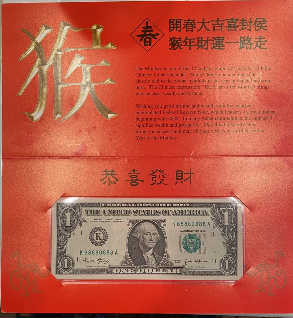 2004年是中國農曆的猴年. 為慶祝中國農曆的新年, 美國財政部印鈔局發行了限量版的吉利錢, 每年一枚, 數量為10萬張一元錢的紀念貨幣, 而編號也符合中國人的喜慶風俗, 以8888開頭, 從2002年開始, 到今年已經發行了21年, 每到發行的時刻, 都需要訂購, 一旦錯過預定時機, 只能靜等次年了. 2004年猴年紀念中國猴年的吉利錢折疊紅卡上的春聯, 就是由畫家何念丹老師所編撰.