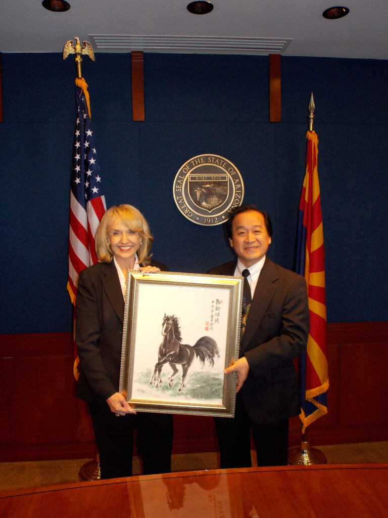 由於念丹兄畫虎,畫魚,畫老鷹, 畫馬…在美國的影響力也越來越大, 亞利桑那州州長Janice Brewer女士和鳳凰城市長Jim Waring特別邀請何念丹到州政府首府博物館和市政府大廳舉辦個人畫展,成為華裔藝術家在州政府舉辦個人畫展的第一人, 同時還介紹洛杉磯的書法藝術家孫曉華到鳳凰城展示書法藝術,而且在何老師的感召下, 本人也隨同洛杉磯團隊到鳳凰城, 現場書寫春聯迎春接福, 推動了中美民間文化的交流, 是中華優秀文化在亞利桑那州的推廣者和傳播者, 深受當地民眾的歡迎, 參訪者讚不絕口, 一時“鳳城紙貴”, 尤其是他們的現場揮毫, 更是吸引人們的眼球, “揮動一隻毛筆, 色彩千軍萬馬, 黑白之間顯神威, 彩色宣紙驚四方. ”