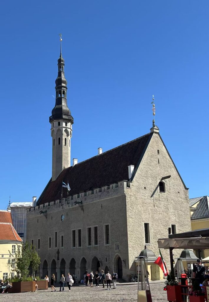 首都塔林(Tallin),在愛沙尼亞語中的意思是“丹麥人的城市”。1219年丹麥國王瓦爾德瑪·維克托里斯(也稱勝利王)率十字軍對愛沙尼亞異教徒北征。6月15日的隆達尼斯戰鬥中,人數大大少於愛沙尼亞人的丹軍陷入困境。突然,一面帶有白色十字的紅旗從天而降,並伴隨着一個由天而來響亮的聲音:“抓住這面旗幟就是勝利!”在這面旗幟的鼓舞下,丹軍奮勇作戰,轉敗爲勝。此後白色十字紅旗就成爲丹麥王國的國旗。上帝降給丹麥人旗幟的地方,就在老城城牆下方,如今立有標誌和說明。從此,丹麥人便開始在這裏築城。該城「城頭變換大王旗」,數易其主,並不斷被建造。這都因由丹麥人開始,所以“丹麥城”的名字延續下來。我覺得塔林這個中文音譯很好,暗含這裏是“高塔之林”,幾十座用於防禦的塔樓和教堂的鐘樓直指蒼天。老市政廳就有一座137級階梯、64米高的尖塔。上面有鍾,守塔人負責瞭望觀察敵情火情。我爬上塔頂,在塔頂俯視市政廳廣場等地。現存的市政廳建於1402-1404年間,是斯堪地那維亞和波羅的海地區最古老的市政廳,一直使用到1970年。現在也常在此舉辦慶典。