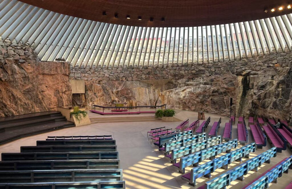 赫尔辛基2012年被國際工業設計協會評為世界設計之都(The World Design Capital)。這裡不愧是藝術之城、設計之都。僅舉兩例赫爾辛基另類教堂。其一:岩石教堂。在整個小石山,挖出一個圓形的空間,牆壁就是未經打磨的花崗岩,可以看到開挖時各種斧鑿鑽孔的痕跡。教堂頂端的拱顶直徑24公尺,由長達22公里的銅條盤繞成底面,然後用鋼筋混凝土的肋樑與周圍岩石銜接,這些條狀的樑柱之間再以180面透明天窗併連,這就形成了一圈360度的光環,使得穹頂仿佛浮在半空中,並且全面自然採光。內可容納1000人。