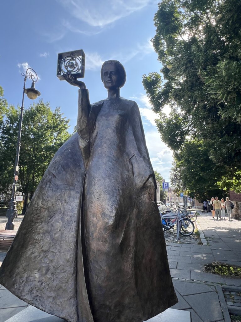 居里夫人出生的地方現在是博物館,介紹她的生平。她發現了釙和鐳。她以釙(po)命名新元素,就是為了紀念當時已亡國的波蘭。當年她和丈夫皮埃爾一同獲諾貝爾物理獎,後來她又獲得諾貝爾化學獎。她的女兒Eva為她的母親寫的傳記,被譯成25種文字,共再版80多次。好萊塢電影「居里夫人」也獲得多項奧斯卡提名。她和愛因斯坦保持20多年的通信,目前已被收錄成為一部專輯,書名就叫「Letters」。在其故居附近,有一幅全身雕像。居里夫人年輕時很漂亮,而中年時則更有氣質,有一種成熟女性之美。當年他的丈夫皮埃爾因在大雨中橫穿馬路,被馬車撞死。居里夫人和她的同事產生了一段戀情,後來被男方的妻子公諸於眾。居里夫人也成了媒體焦點。報紙上登有整版報導和她穿著正裝走在巴黎街頭的巨幅照片。說實話,我是真喜歡她的這張照片。